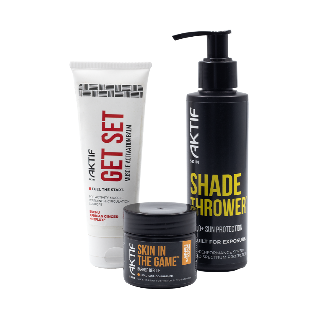 Use Get Set to warm up muscles before activity and improve mobility. Shade Thrower provides sweat-compatible SPF50 protection against sun and heat exposure. Skin in the Game targets high-friction areas and skin stress — helping your skin recover quickly from irritation, rubbing, or surface damage. A performance-driven kit designed for real movement, wherever it happens.